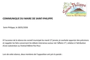 Saint-Philippe, le 28/01/2026 À l’occasion de la séance du conseil municipal du mardi 27 janvier, je souhaite apporter des précisions et rappeler les faits concernant les débats intervenus autour de l’affaire n°7, relative à l’attribution d’une subvention au Festival Même…