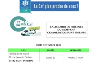 Le Mobi’Caf sera présent sur le parking de la mairie le Lundi 23 Février 2026 de 9h00 à 14h30. Pour cela vous pouvez vous inscrire auprès du CCAS de Saint-Philippe au 0262 37 00 17.