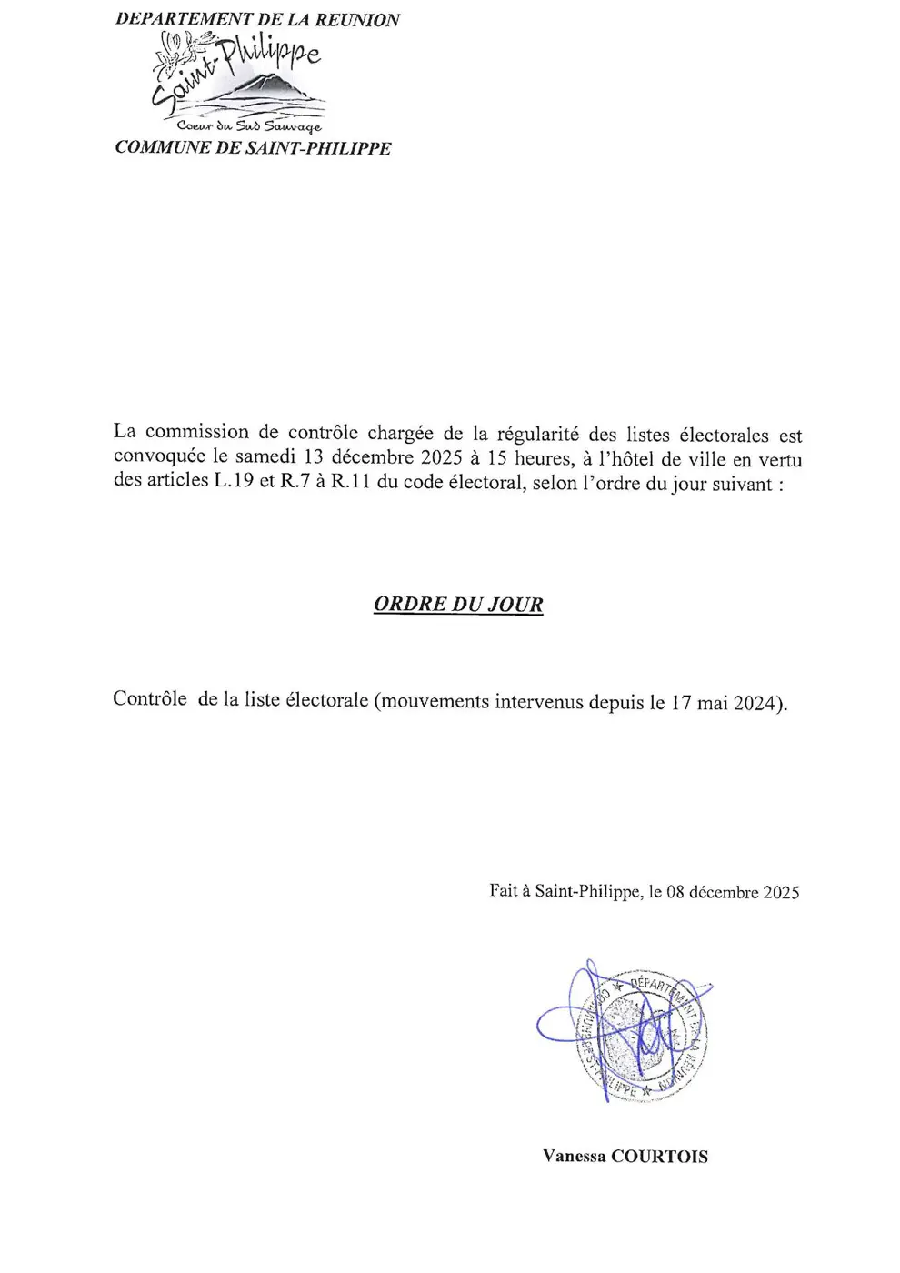 La commission de contrôle chargée de la régularité des listes électorales est convoquée le samedi 13 décembre 2025 à 15 heures, à l’hôtel de ville en vertu des articles L.19 et R.7 à R.11 du code électoral, selon l’ordre du jour suivant :
