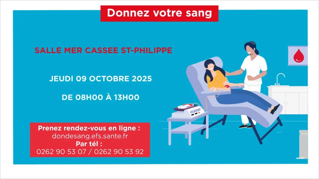 L’Etablissement Français du Sang (EFS) organise une collecte de sang le jeudi 09 Octobre 2025 de 8H00 à 13h00 sur Saint-Philippe à la salle de la Mer Cassée.