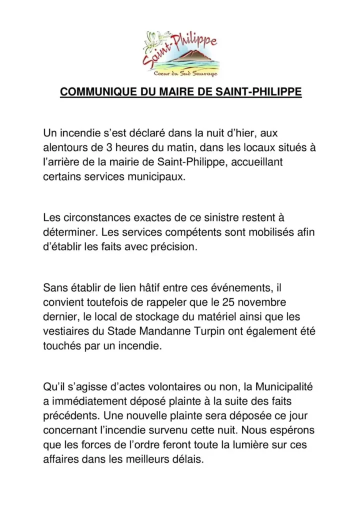 Un incendie s’est déclaré dans la nuit d’hier, aux alentours de 3 heures du matin, dans les locaux situés à l’arrière de la mairie de Saint-Philippe, accueillant certains services municipaux.