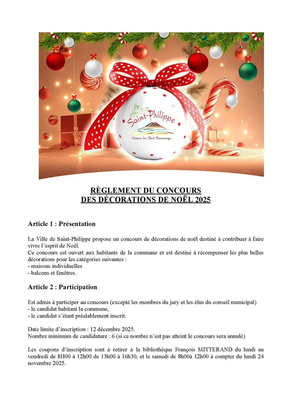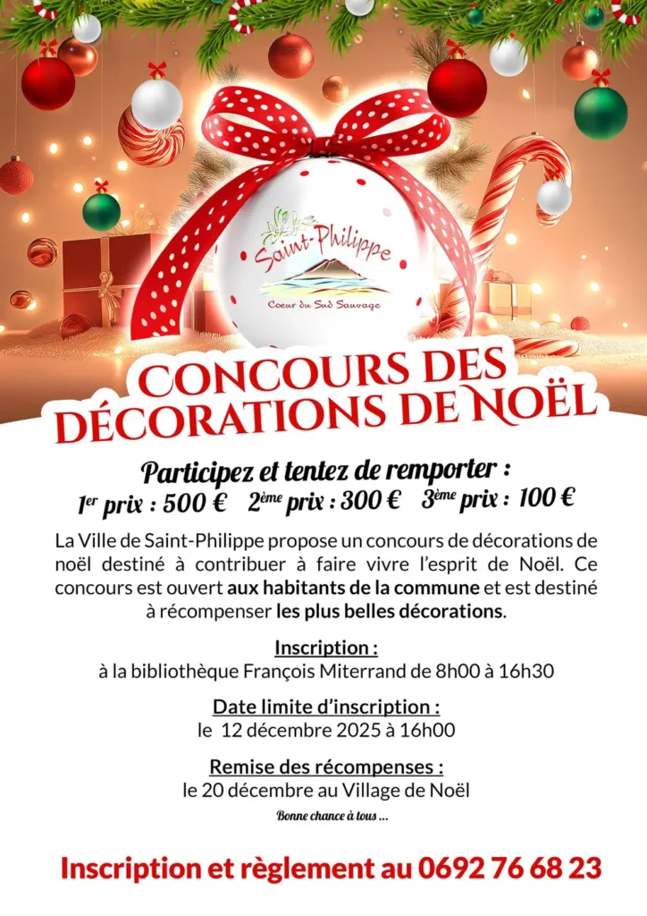 La ville de Saint-Philippe propose un concours de décorations de Noël destiné à contribuer à faire vivre l’esprit de Noël. Ce concours est ouvert aux habitants de la commune et est destiné à récompenser les plus belles décorations.