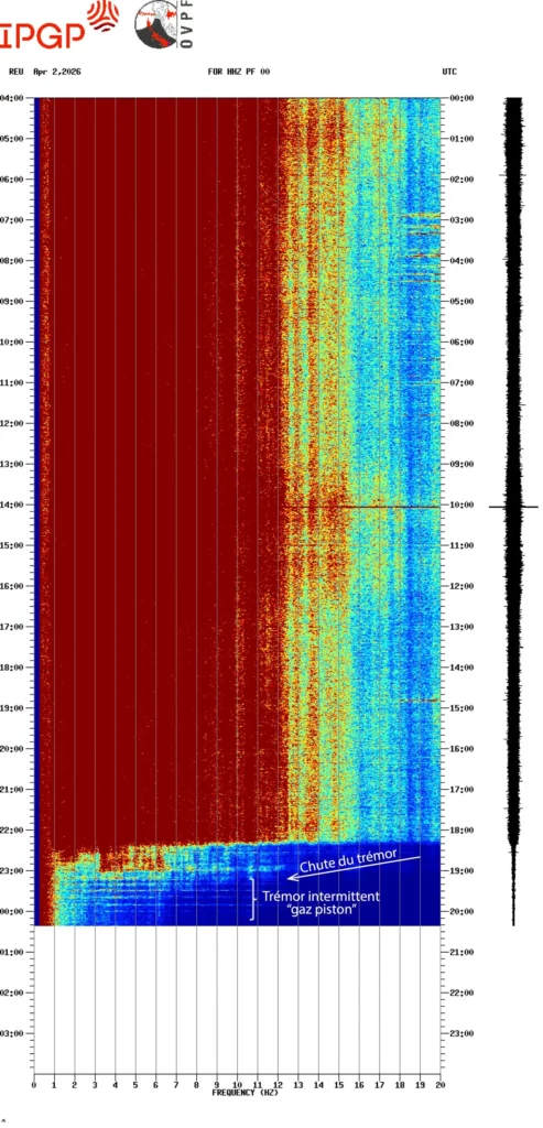 - Chute brutale de l’amplitude du trémor éruptif le 2 avril à 22h20, suivie d’un trémor intermittent de très faible amplitude de type « gaz piston ».