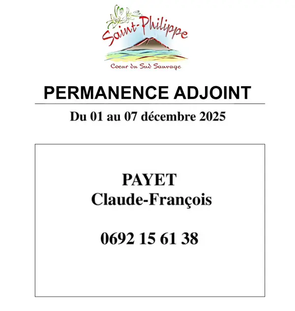 Accueil Communiqués INFO : Permanence adjoint du 01 au 07 décembre 2025 INFO : Permanence adjoint du 01 au 07 décembre 2025Communiqués1 décembre 2025 TEXTE : Permanence Adjoint du 01 au 07 Décembre 2025. PAYET Claude-François, Tél : 0692 15 61 38