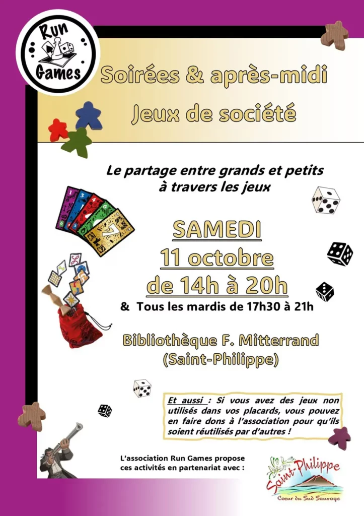 L’association RUN GAMES, en partenariat avec la commune de Saint-Philippe, organise des soirées et après-midi jeux de société à la bibliothèque François Mitterrand tous les Mardis de 17H30 à 21H et le Samedi 11 Octobre de 14H à 20H.