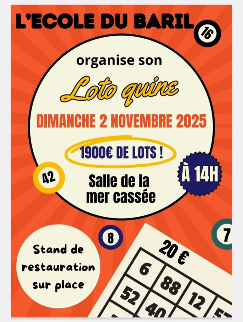 L’école du Baril organise sont loto quine le Dimanche 02 Novembre 2025, à partir de 14H dans la salle de la Mer Cassée. 1900€ de lots à gagner !