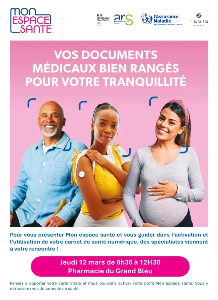 Mon Espace Santé vous accueillera à la Pharmacie du Grand Bleu à Basse Vallée le Jeudi 12 Mars 2026. Des spécialistes vous présenterons l’application Mon Espace santé et vous guiderons dans l’activation et l’utilisation de votre carnet de santé numérique.
