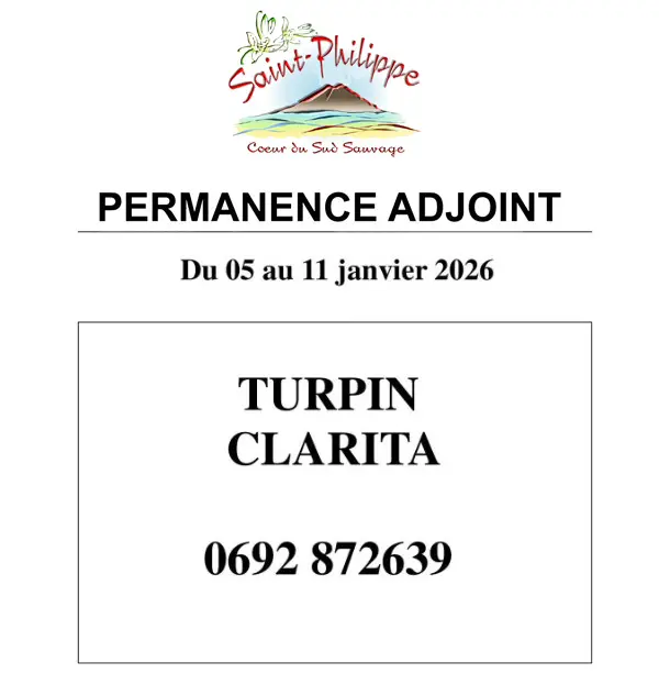 Accueil Communiqués Permanence adjoint du 05 au 11 Janvier 2026 Permanence adjoint du 05 au 11 Janvier 2026Communiqués5 janvier 2026 TEXTE : Permanence Adjoint du 05 au 11 Janvier 2026. TURPIN Clarita, Tél : 0692 87 26 39