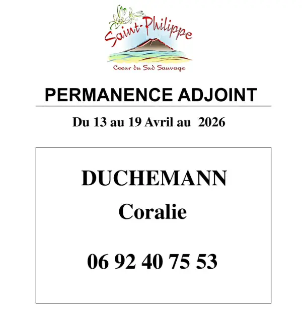 Accueil Communiqués Permanence adjoint du 13 au 19 Avril 2026 Permanence adjoint du 13 au 19 Avril 2026Communiqués13 avril 2026 TEXTE : Permanence Adjoint du 13 au 19 Avril 2026. DUCHEMANN Coralie, Tél : 0692 40 75 53