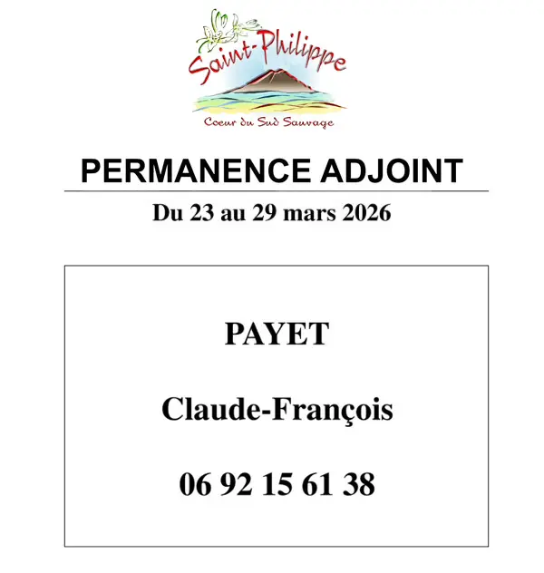 Accueil Communiqués Permanence adjoint du 23 au 29 Mars 2026 Permanence adjoint du 23 au 29 Mars 2026Communiqués25 mars 2026 TEXTE : Permanence Adjoint du 23 au 29 Mars 2026. PAYET Claude-François, Tél : 0692 15 61 38