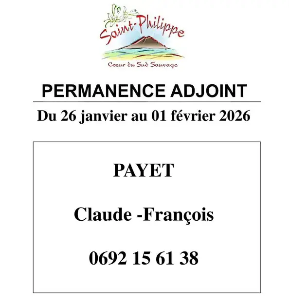 TEXTE : Permanence Adjoint du 26 Janvier au 01 Février 2026. PAYET Claude-François, Tél : 0692 15 61 38