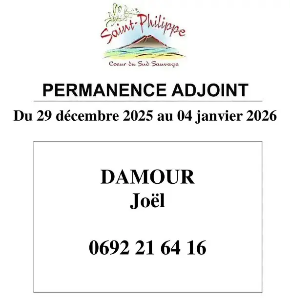TEXTE : Permanence Adjoint du 29 Décembre 2025 au 04 Janvier 2026. DAMOUR Joël, Tél : 0692 21 64 16