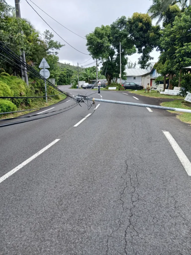 ATTENTION – un poteau Télécom s’est couché en travers de la route ( en pleine courbe ) au niveau de l’école du Tremblet.