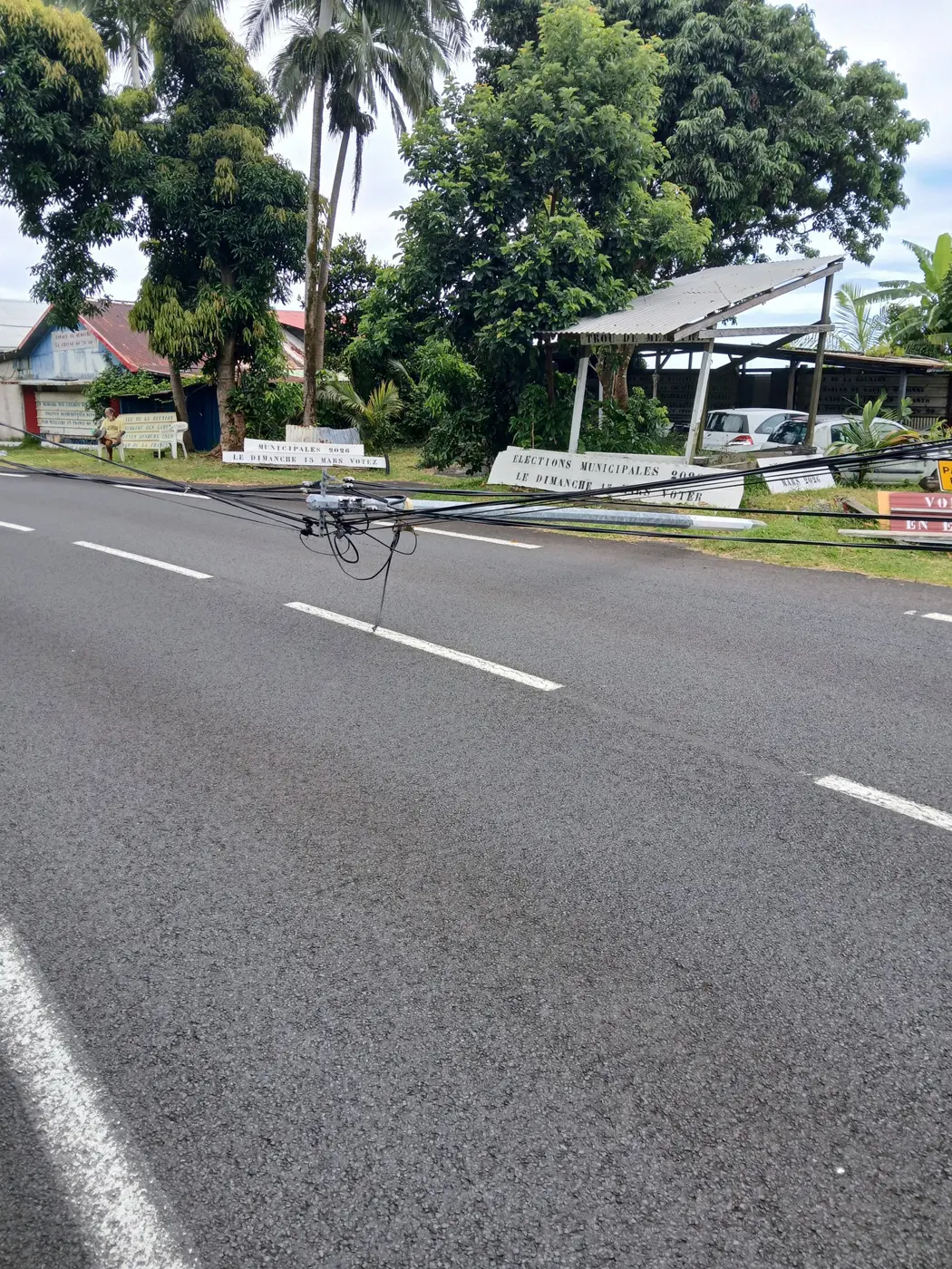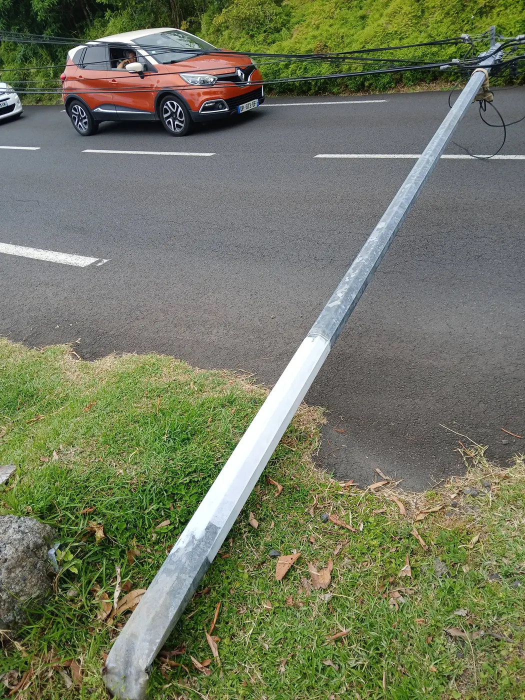 ATTENTION – un poteau Télécom s’est couché en travers de la route ( en pleine courbe ) au niveau de l’école du Tremblet.