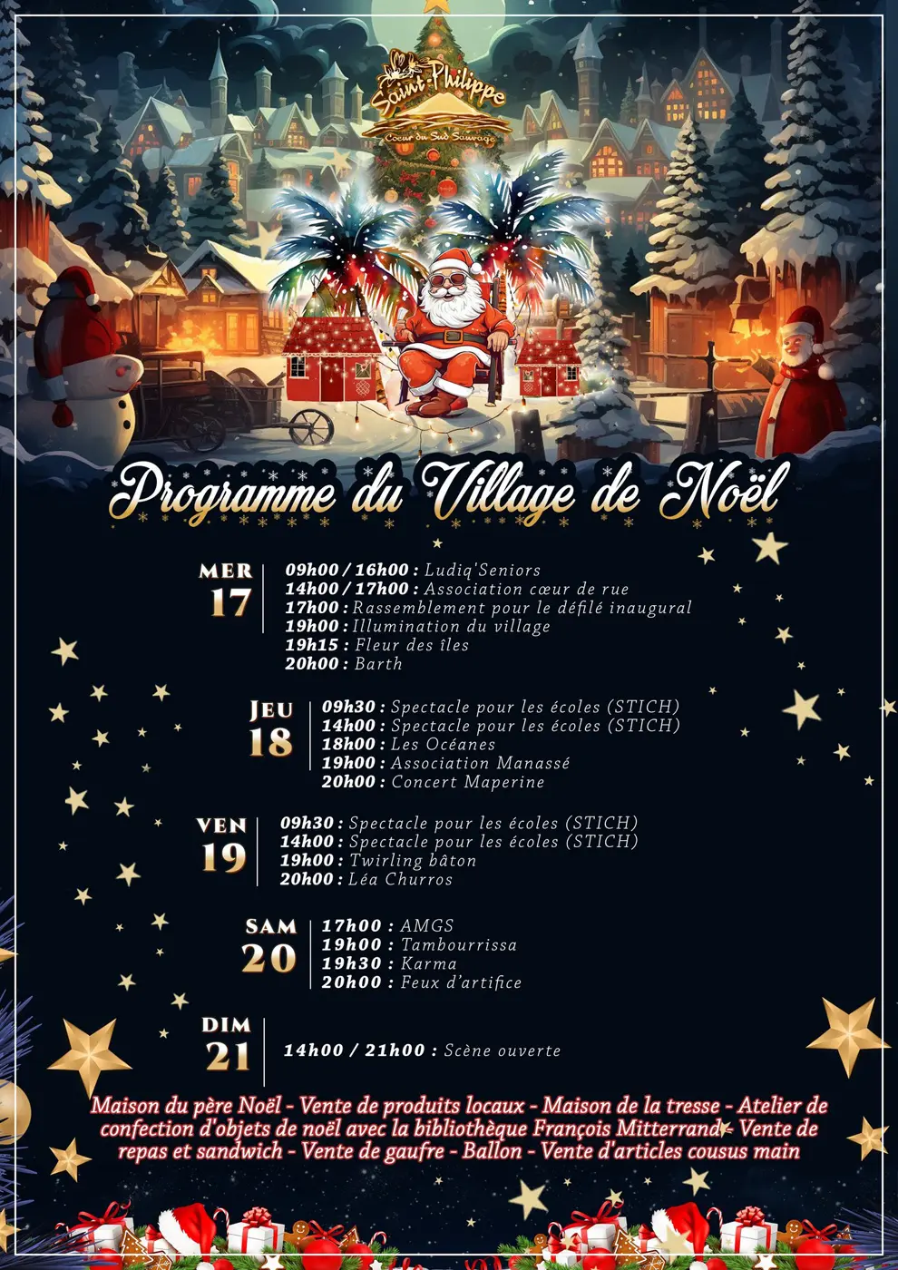 Programmation du Village de Noël qui se déroulera du 17 au 21 décembre 2025 sur le site de Baril les bains .