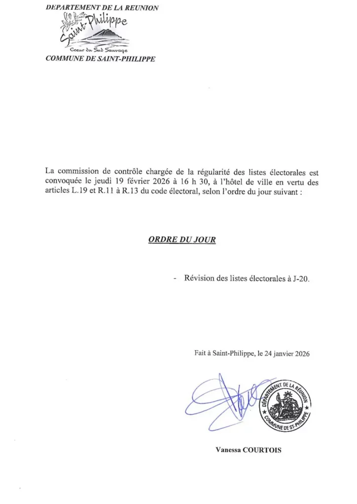 La commission de contrôle chargée de la régularité des listes électorales est convoquée le Jeudi 19 Février 2026 à 16h30, à l’hôtel de ville en vertu des articles L.19 et R.13 du code électoral, selon l’ordre du jour suivant :