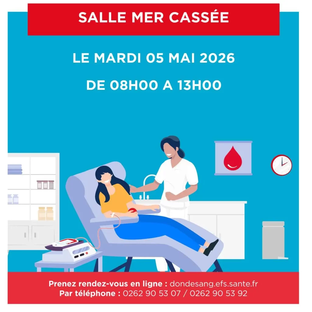 l’Etablissement Français du Sang (EFS) organise une collecte à la salle de La Mer Cassée le mardi 05 mai 2026 de 08H à 13H.