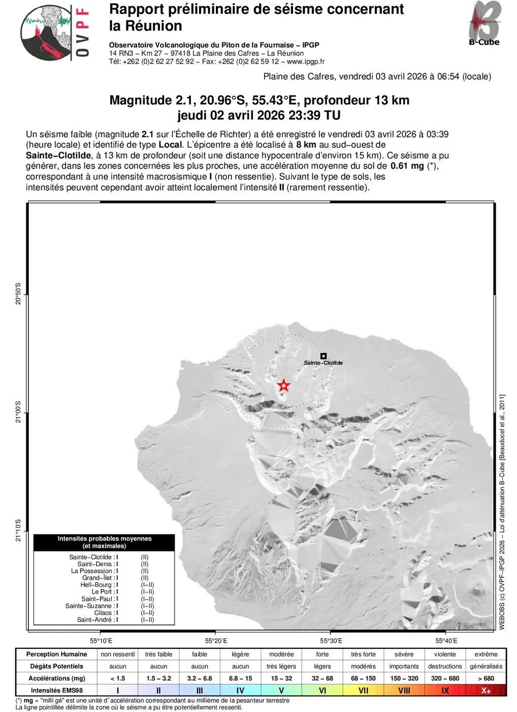 – Un séisme a été ressenti le vendredi 3 avril 2026 à 03h39 heure locale (23h39 TU le 2 avril) par des habitants de l’île, principalement dans le secteur nord.
