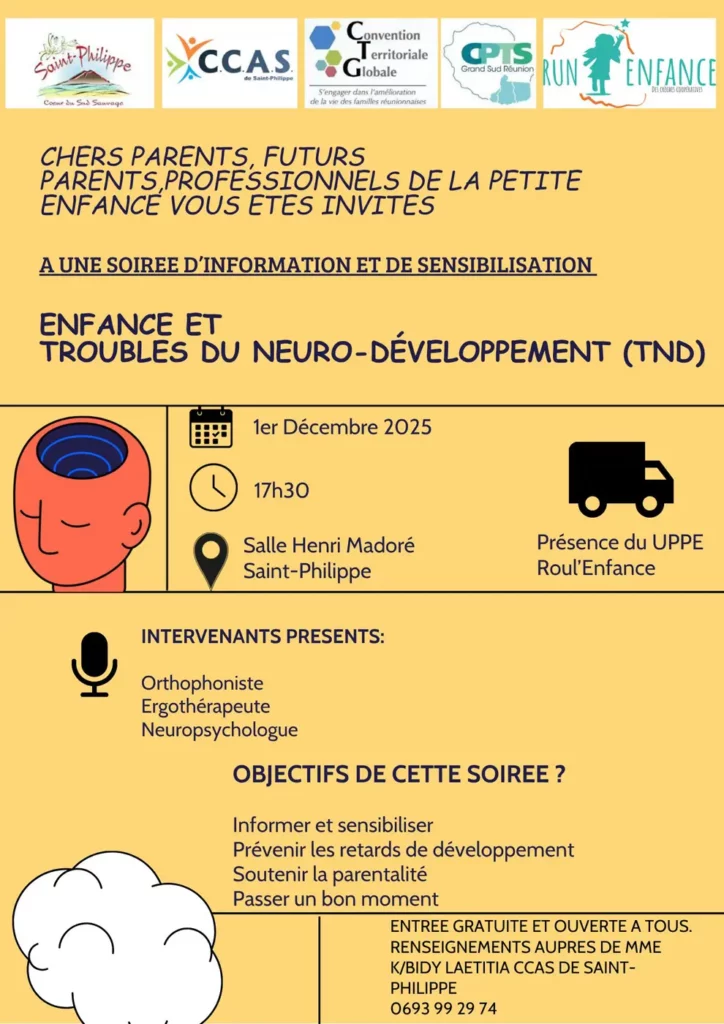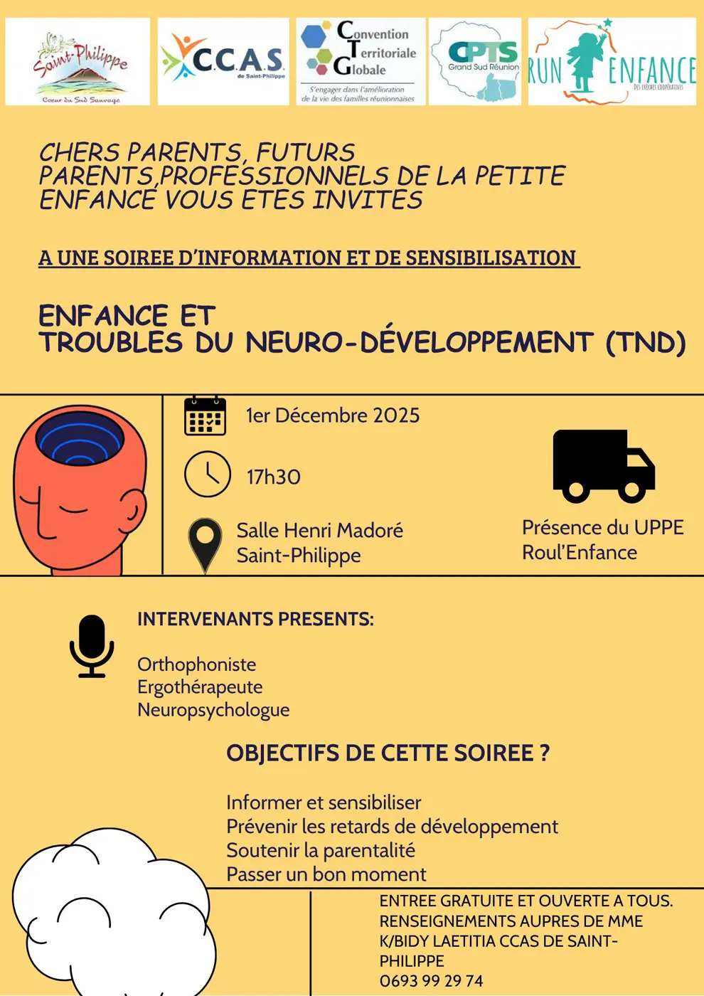 En partenariat avec le CPTS Grand Sud, le CCAS de Saint-Philippe organise une soirée d’information et de sensibilisation autour des TND Troubles du Neuro-Développement. Cette soirée est ouverte aux parents, futurs parents, professionnels de santé et professionnels œuvrant avec les enfants.
